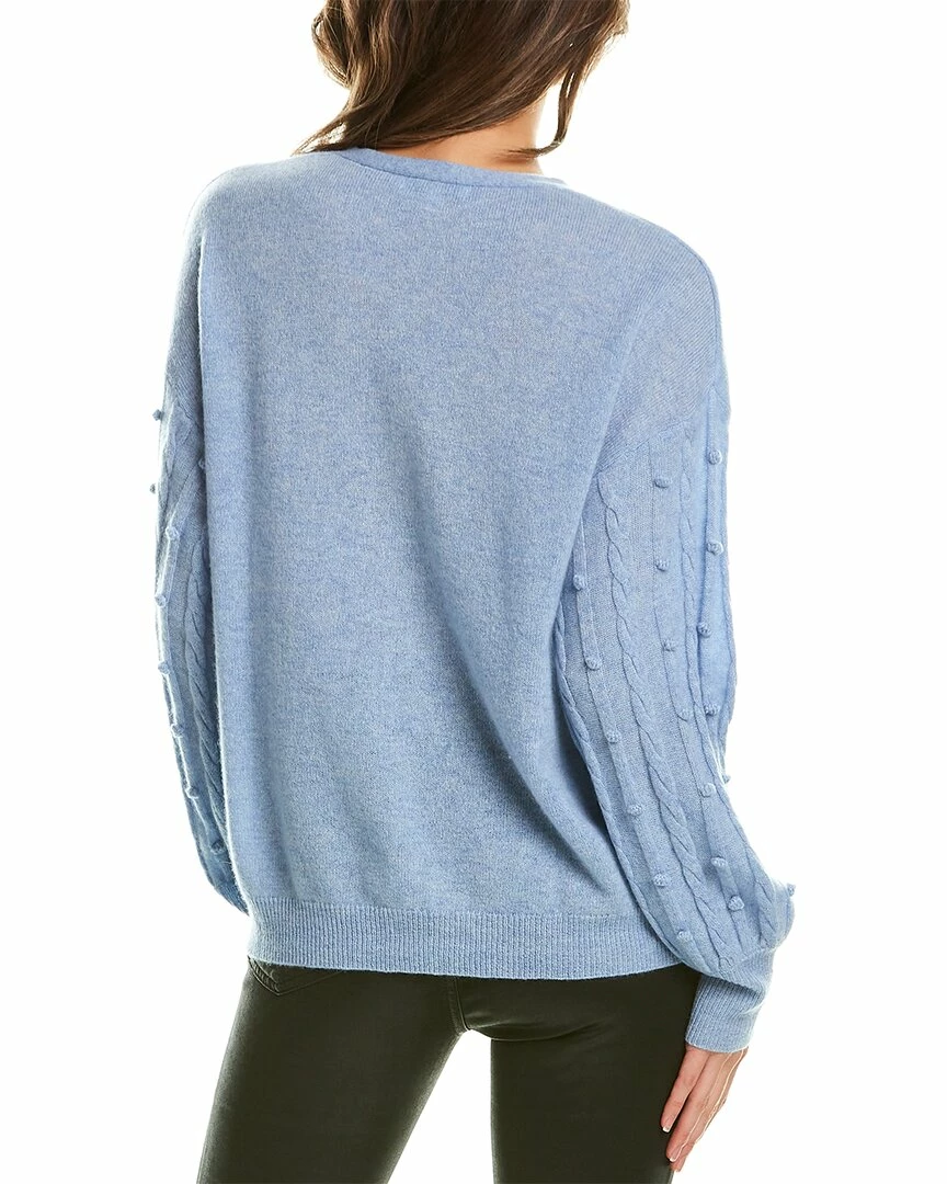 - Bobble Sleeve Cashmere Sweater in sky with turtleneck, knit bobbles at sleeves, and ribbed trim