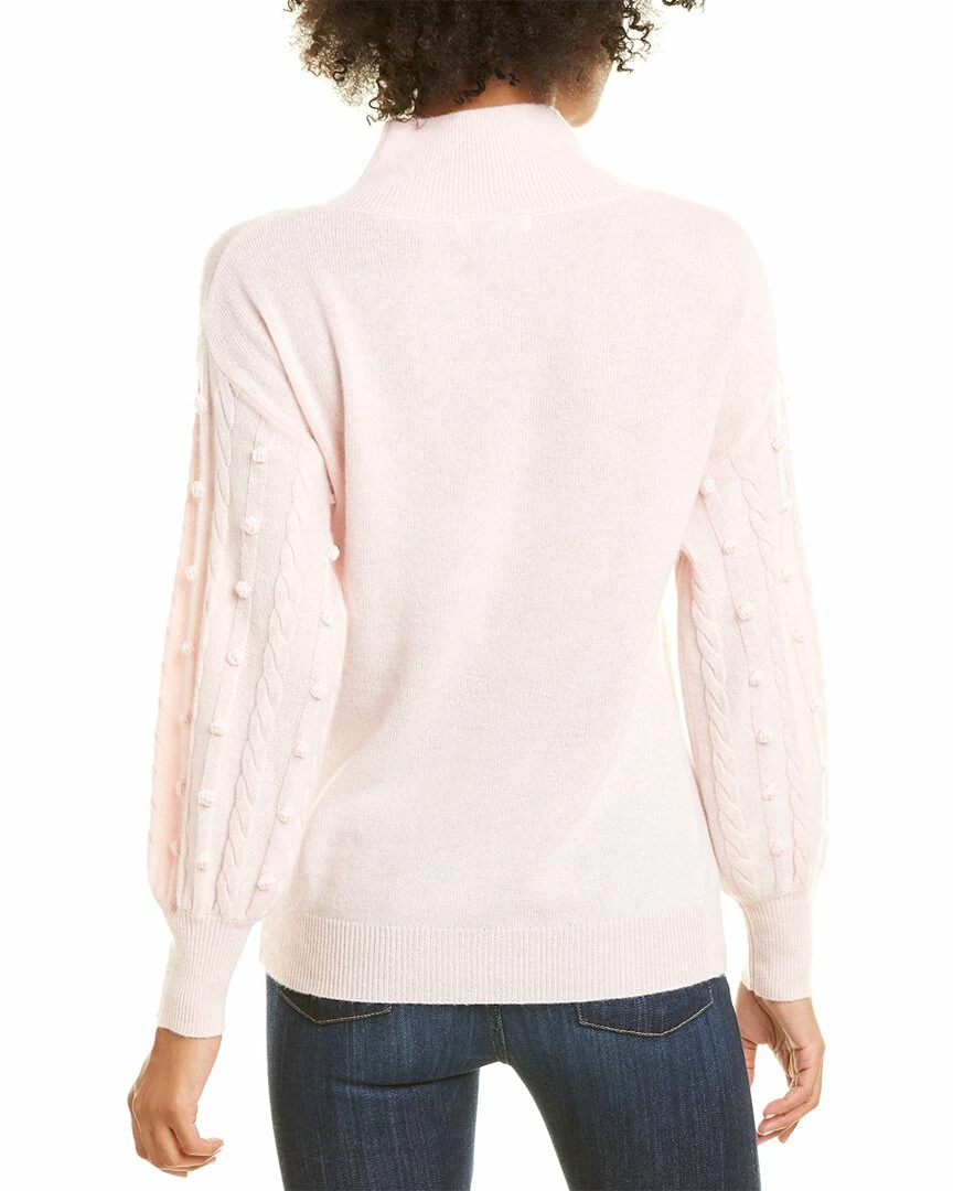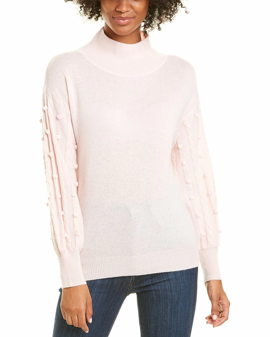 - Bobble Sleeve Cashmere Sweater in cherry blossom with turtleneck, knit bobbles at sleeves and ribbed trim