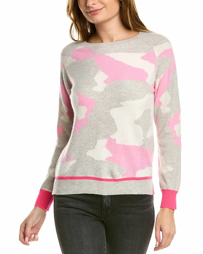 - Coco Camo Cashmere Sweater in ballerina pink and fluffy grey with raglan sleeves and ribbed trim