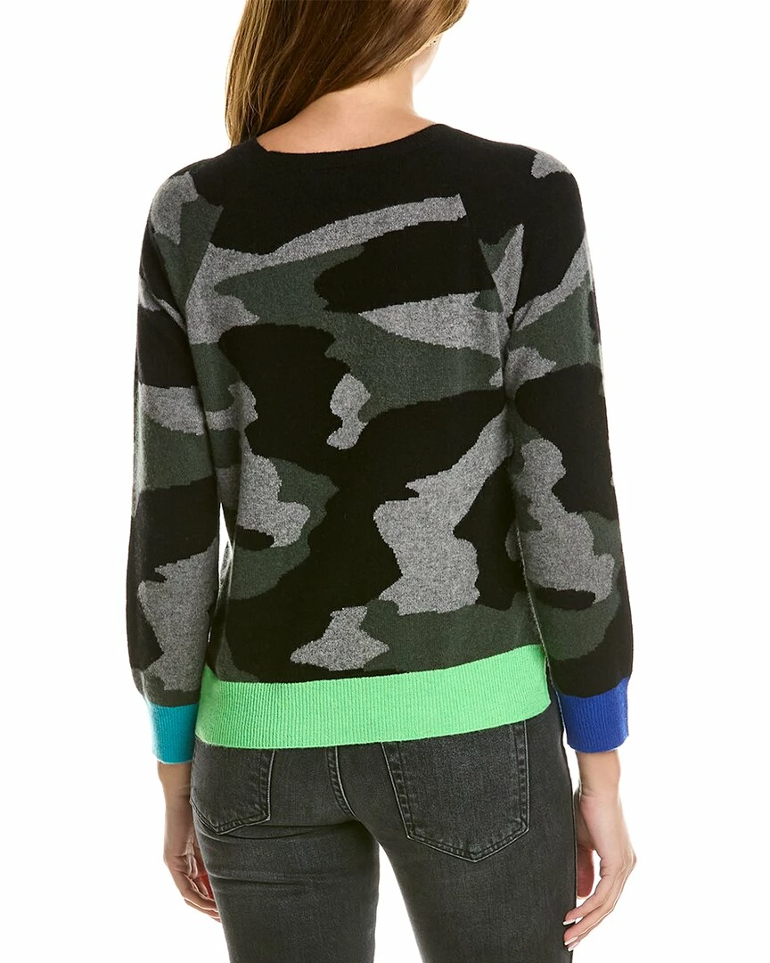 - Contrast Camo Cashmere Sweater in black and mild grey with raglan sleeves and ribbed trim