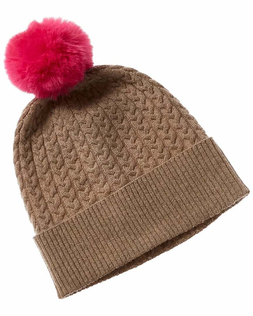 - Plait Cable Pom Cashmere Hat in brown with cable knit, ribbed trim and faux fur pom