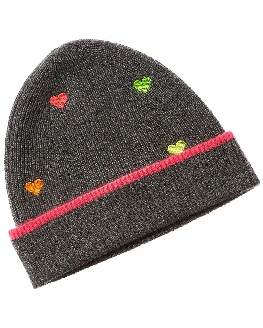 - Rainbow Heart Embroidery Cashmere Beanie in grey with embroidered design