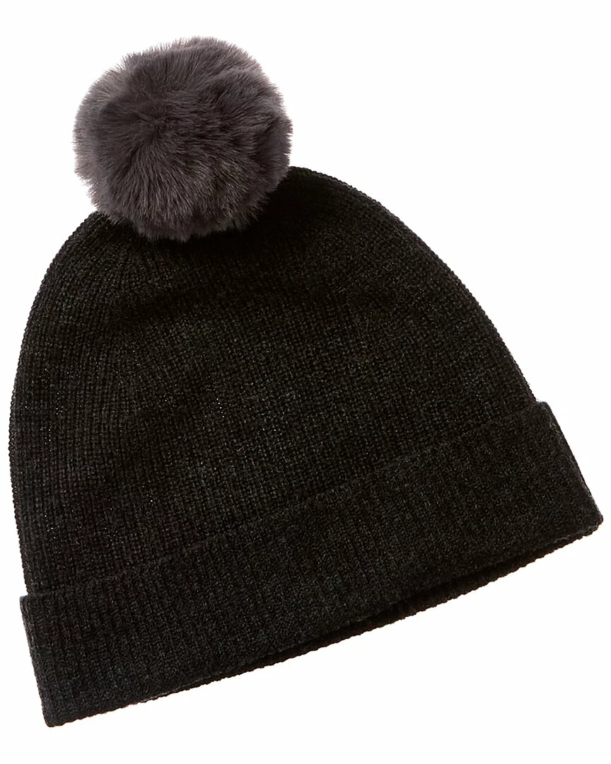 - Ribbed Cashmere Hat in charcoal with faux fur pom