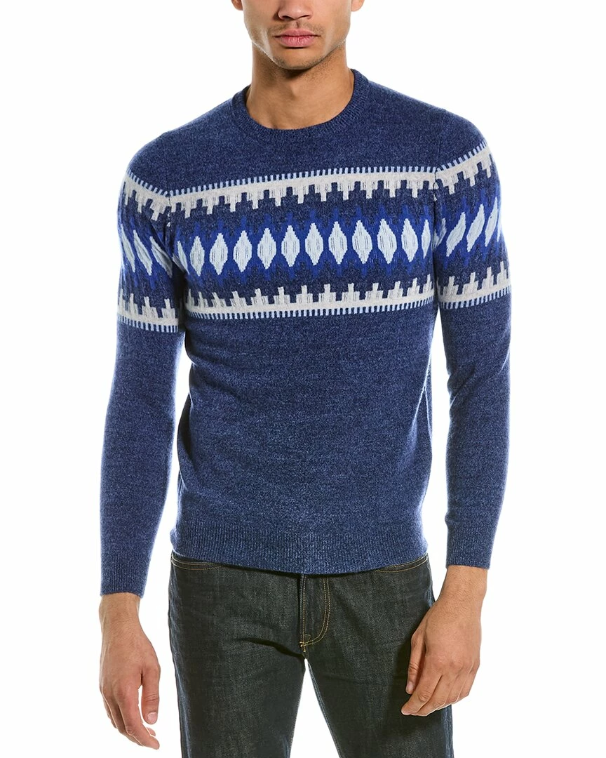 - Tonal Fairisle Wool & Cashmere-Blend Crewneck Sweater in blue multicolor with ribbed trim