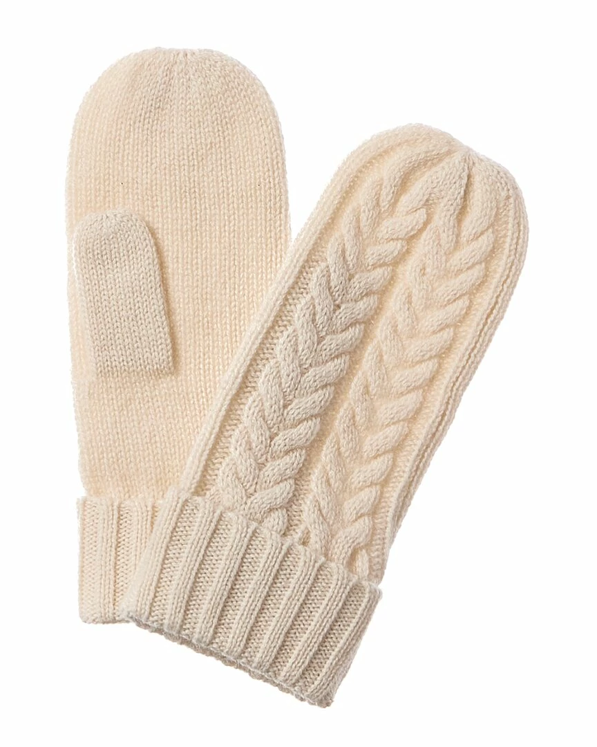 - Twist Cable Cashmere Mittens in white with rolled cuffs