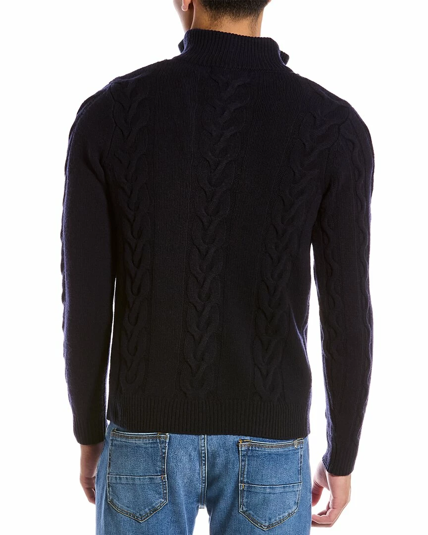- Wool Sweater in navy with cable-knit design, stand-up collar, and ribbed trim